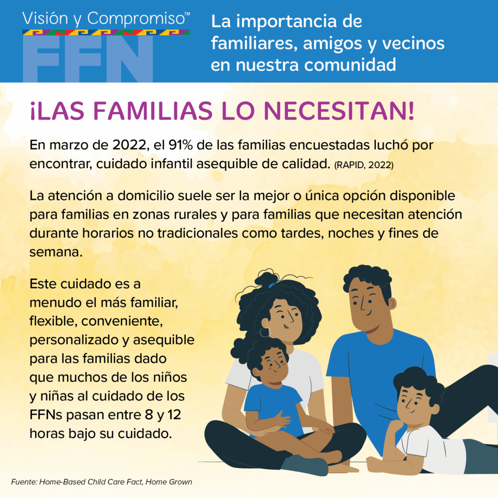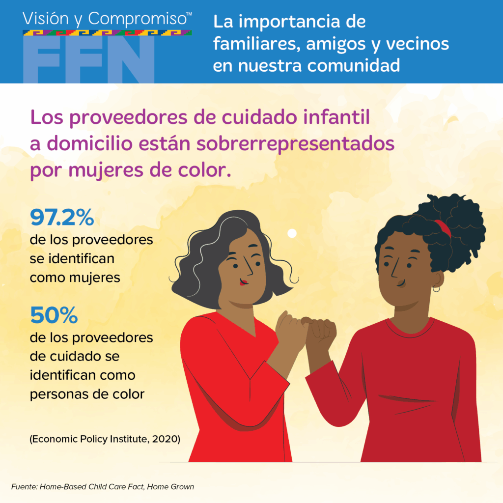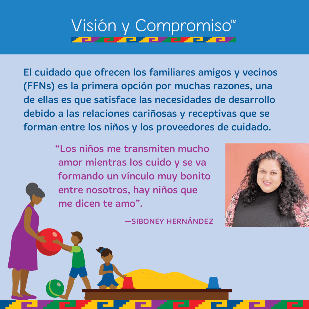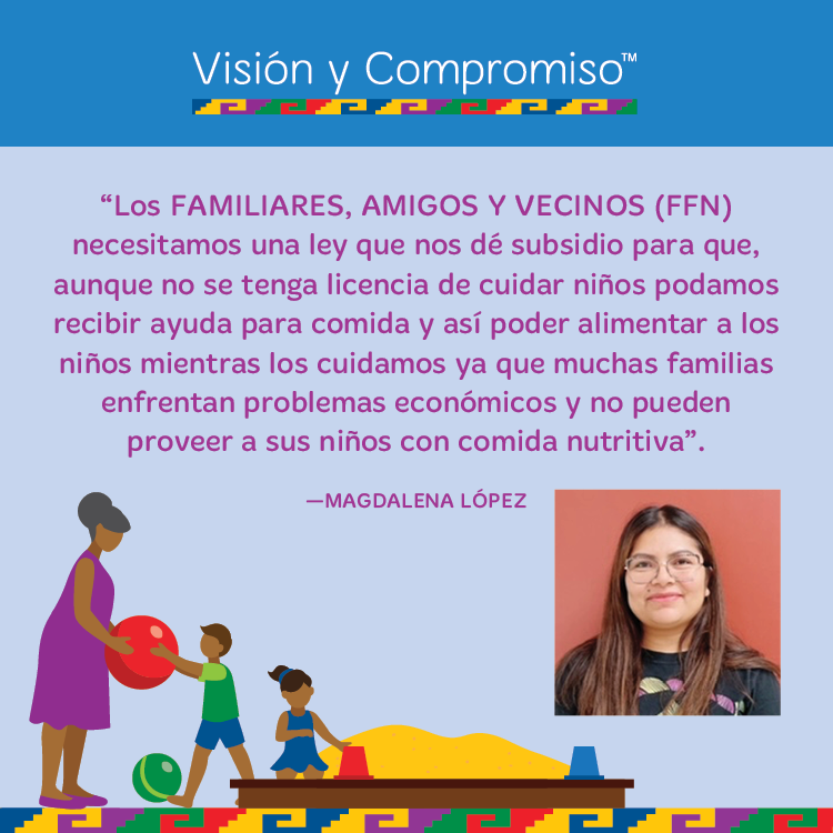 Vision and Commitment’s Family Caregivers Project (FCP) was created in 2017 to support caregivers who are Familia, Amistad, y Vecino (FFN) caregivers. FCP recognizes FFN caregivers as key community resources as they develop their skills to create a strong foundation and nurturing home environment that supports the physical, emotional, social, and cognitive well-being of the children in their care. FCP includes a 48-hour training in Spanish, divided into five to eight learning modules, with CPR/First Aid certification, and peer-facilitated social support groups. Since its inception, nearly 750 FFN caregivers in California have graduated from this training, increasing their knowledge and skills and demonstrating improved communication among the families who entrust the care of FFNs.